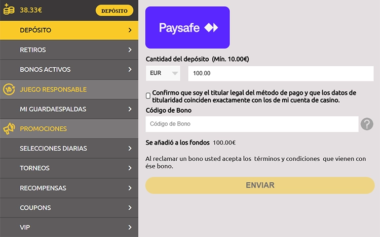 Con el dinero ya en tu cuenta de Paysafecard, basta con que elijas este método para realizar un pago en cualquier casino, con 50 euros de límite máximo por operación.